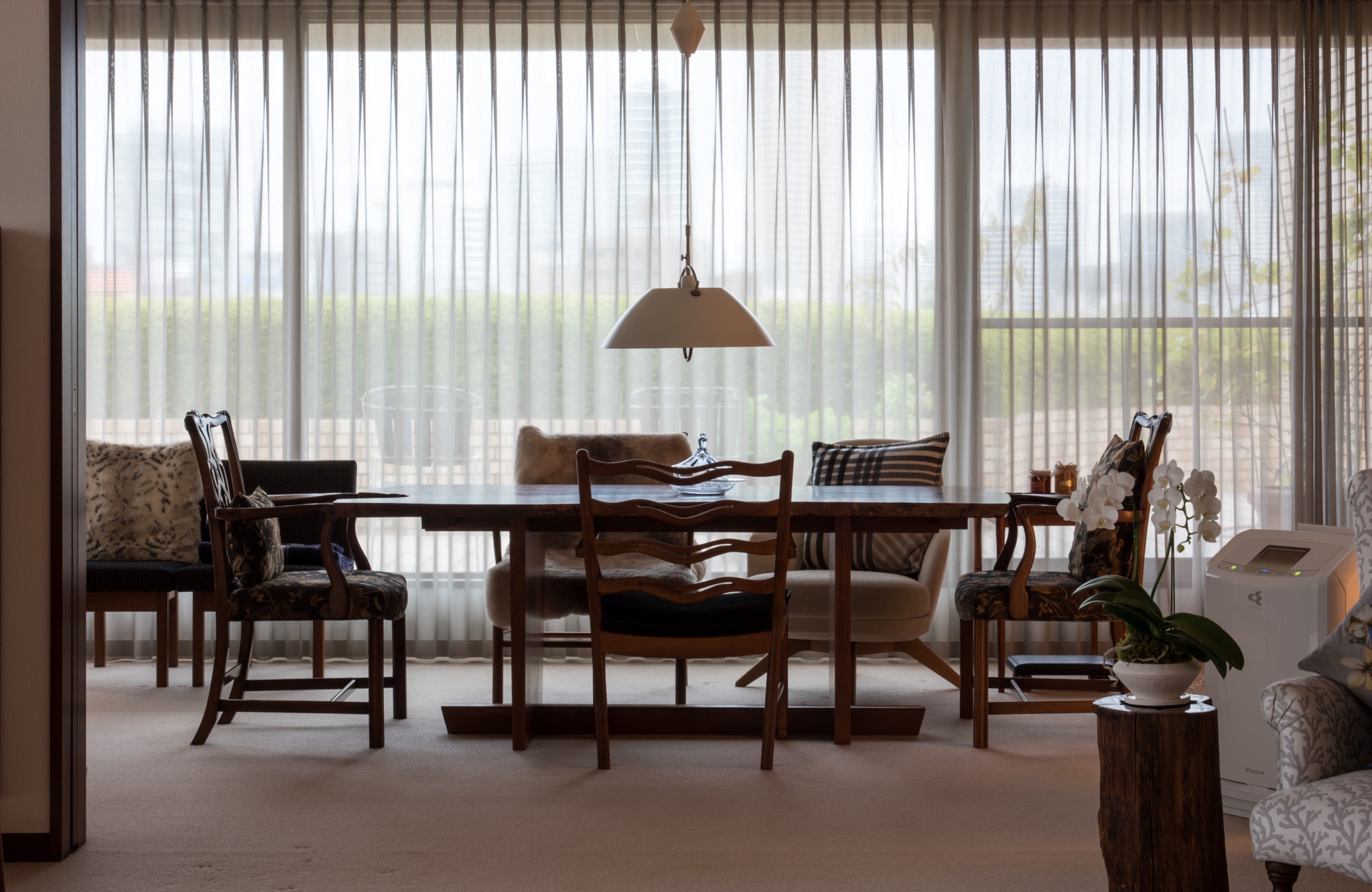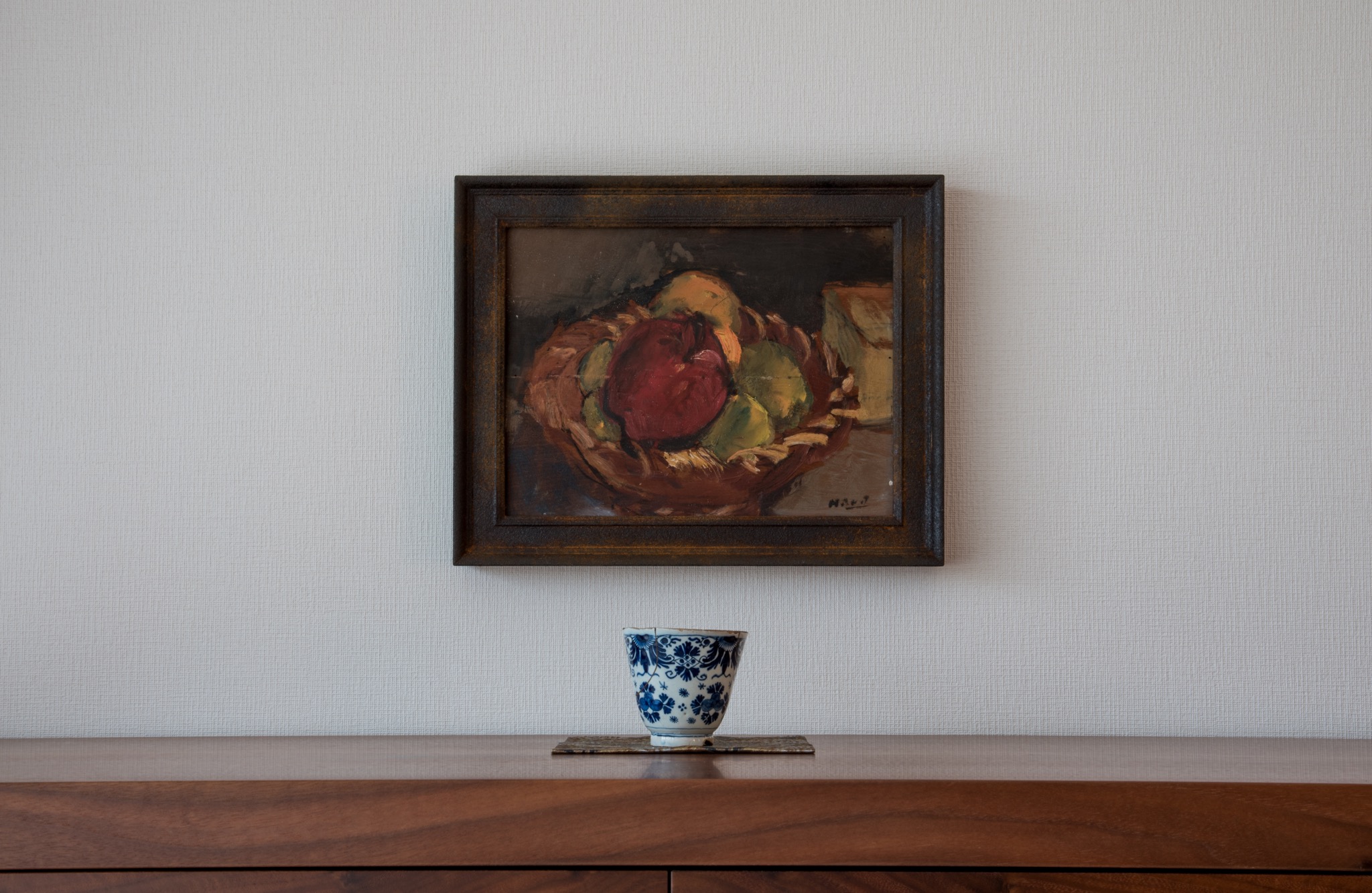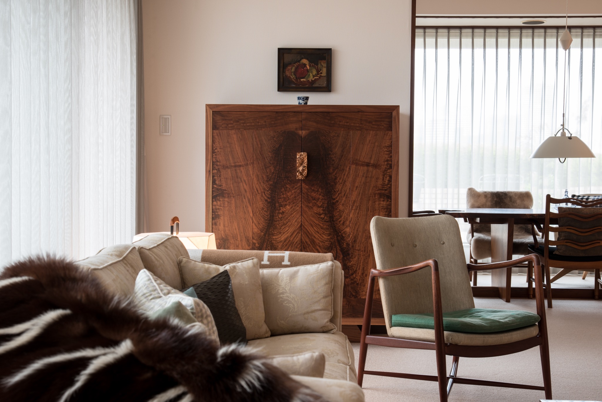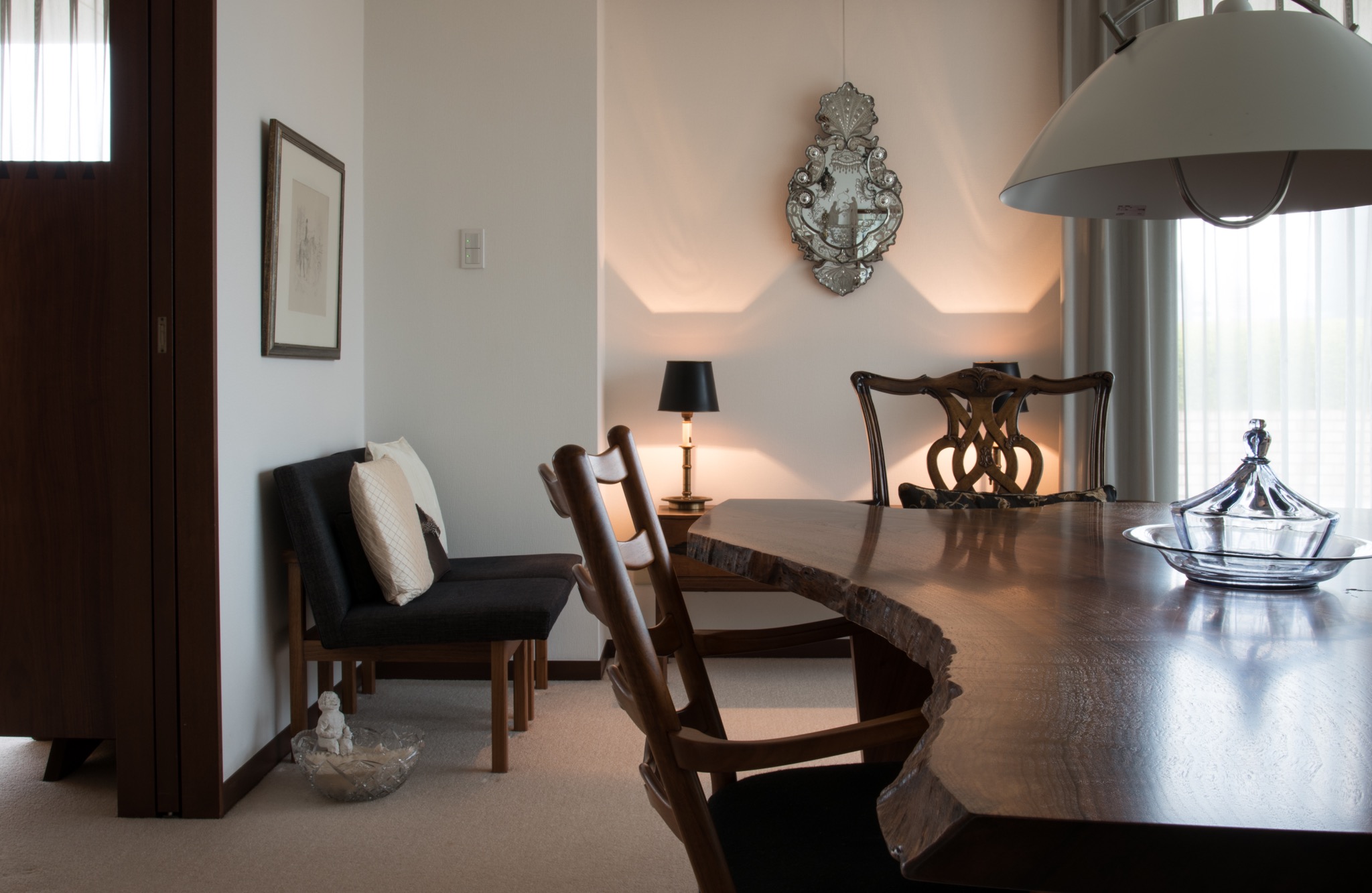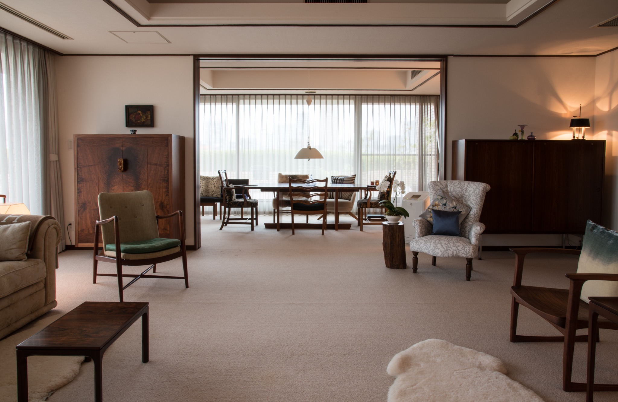 東京都港区南青山のヴィンテージマンション。オーナーは60歳代の女性。ゆったりとした空間に様々な調度品やコレクションが配置されています。かつて学生を含め一般人を対象に、日本の博物館法に定められた学芸員資格を取るための講座が早稲田大学で開催されたことがあったそうで、人生のチャレンジとして受講されたとのこと。その授業では、美術史や博物館史、経営論、教育論はもとより、美術品の梱包、展示、保存、修復に至るまで教えられ、実習を交えて学ばれたそうです。そのような経験をお持ちのオーナーが集められたコレクションは、季節や節句ごとに飾り替えられ、物の持つ特徴や、時の流れを楽しまれています。リビングに置かれたジョージ・ナカシマによるキャビネットの扉板は見事な木目文様の現れたアメリカンブラックウォールナット材が用いられており、これは存命だった頃のナカシマ自身が米国ニューホープの工房で所有していた「材」だそうで、ご縁があり手元にやってきたそうです。ナカシマの天板には裸婦の作家として知られる明治生まれの洋画家、原精一による油彩作品が飾られ、16世紀頃に焼かれたというデルフト窯の器が鎮座していました。イタリアポストモダンを代表するマリオ・ボッタのテーブルランプや、建築家、吉村順三のフロアランプ、イギリスWade社のソファなど、古今東西広い世界から選りすぐりの「品々」が集められています。ダイニングルームに置かれたアクセル・キアスゴー工房のチェストの上の十字架は、マリ共和国で使われていた嫁入りのためのお金で、何枚も束にして紐で括り、嫁ぐ娘の持参金としたものとのことで、パリを歩いている際に通りかかった骨董屋で見つけられたそうです。当店からは、フィン・ユールのファイヤープレイスチェアや、オーレ・ヴァンシャーのテーブルや椅子、ヤコブ・E・バンの蓋つきガラスボウル、ハンス・ウェグナーのキャビネット、ヤイス・ニールセンの素描、ロロ・ピアーナのクッションなどをお納めさせていただきました。