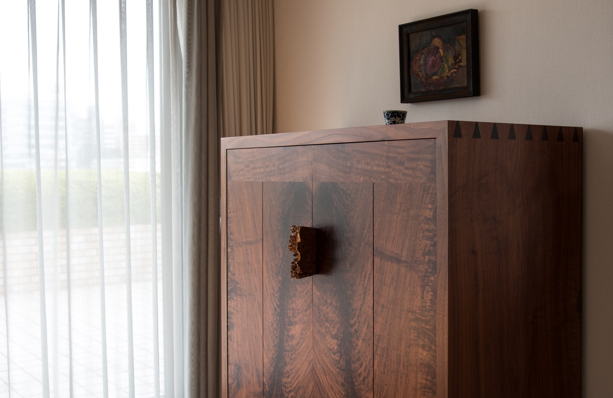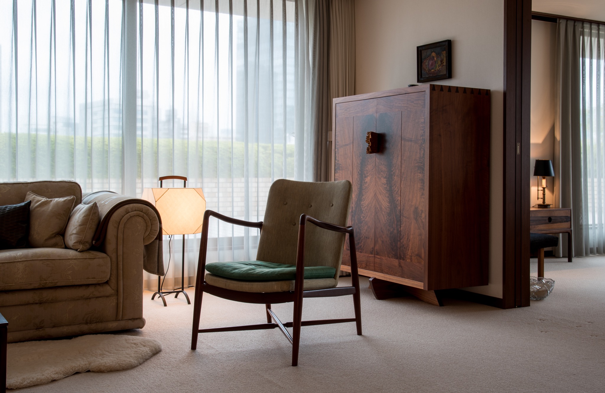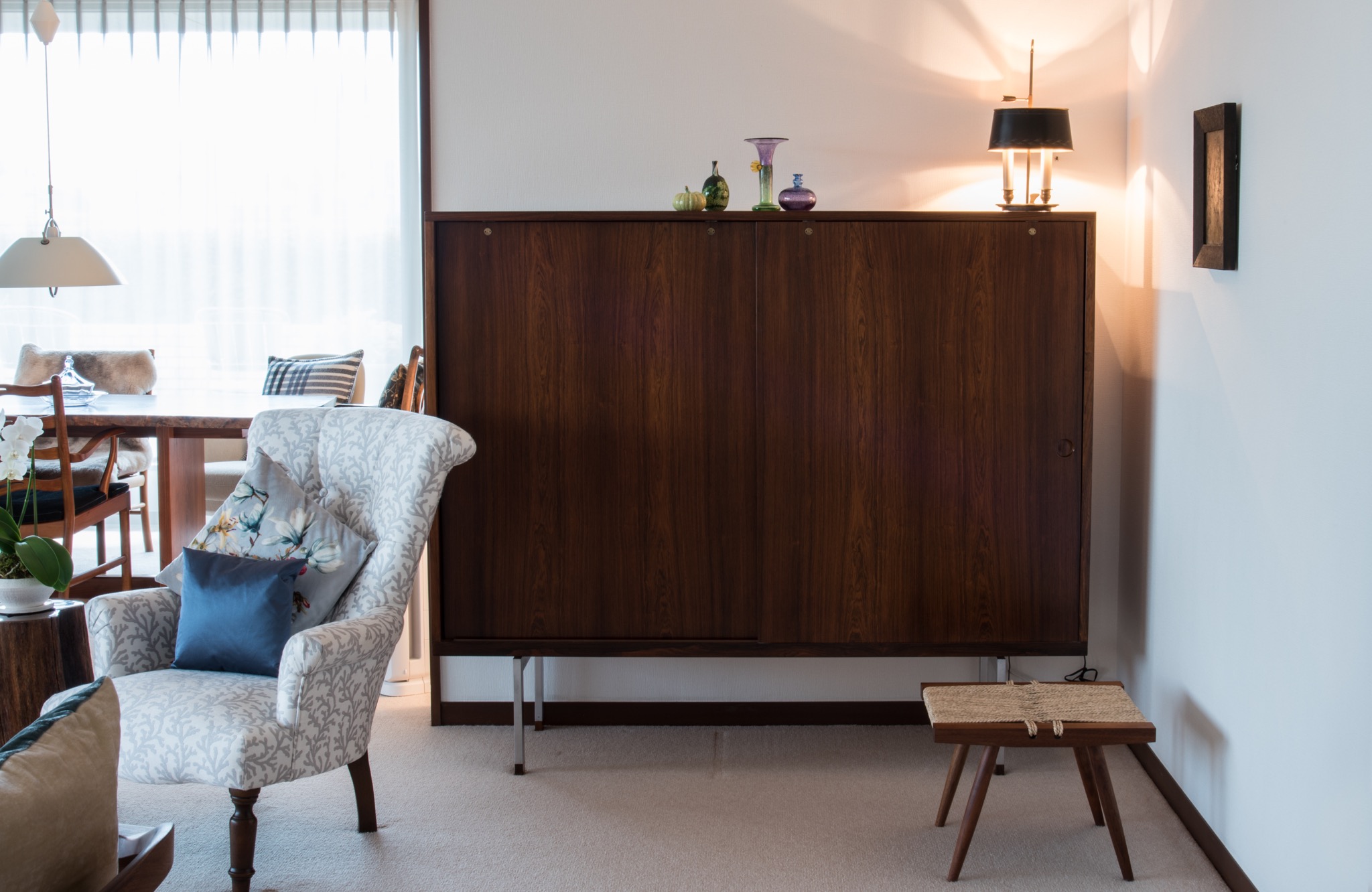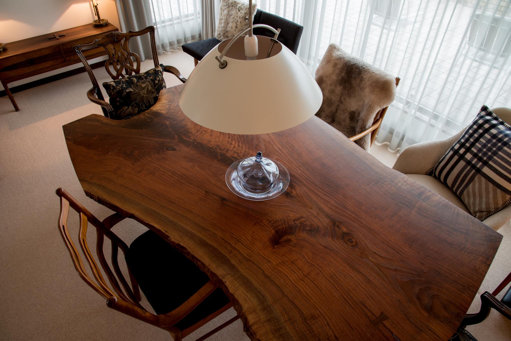 東京都港区南青山のヴィンテージマンション。オーナーは60歳代の女性。ゆったりとした空間に様々な調度品やコレクションが配置されています。かつて学生を含め一般人を対象に、日本の博物館法に定められた学芸員資格を取るための講座が早稲田大学で開催されたことがあったそうで、人生のチャレンジとして受講されたとのこと。その授業では、美術史や博物館史、経営論、教育論はもとより、美術品の梱包、展示、保存、修復に至るまで教えられ、実習を交えて学ばれたそうです。そのような経験をお持ちのオーナーが集められたコレクションは、季節や節句ごとに飾り替えられ、物の持つ特徴や、時の流れを楽しまれています。リビングに置かれたジョージ・ナカシマによるキャビネットの扉板は見事な木目文様の現れたアメリカンブラックウォールナット材が用いられており、これは存命だった頃のナカシマ自身が米国ニューホープの工房で所有していた「材」だそうで、ご縁があり手元にやってきたそうです。ナカシマの天板には裸婦の作家として知られる明治生まれの洋画家、原精一による油彩作品が飾られ、16世紀頃に焼かれたというデルフト窯の器が鎮座していました。イタリアポストモダンを代表するマリオ・ボッタのテーブルランプや、建築家、吉村順三のフロアランプ、イギリスWade社のソファなど、古今東西広い世界から選りすぐりの「品々」が集められています。ダイニングルームに置かれたアクセル・キアスゴー工房のチェストの上の十字架は、マリ共和国で使われていた嫁入りのためのお金で、何枚も束にして紐で括り、嫁ぐ娘の持参金としたものとのことで、パリを歩いている際に通りかかった骨董屋で見つけられたそうです。当店からは、フィン・ユールのファイヤープレイスチェアや、オーレ・ヴァンシャーのテーブルや椅子、ヤコブ・E・バンの蓋つきガラスボウル、ハンス・ウェグナーのキャビネット、ヤイス・ニールセンの素描、ロロ・ピアーナのクッションなどをお納めさせていただきました。